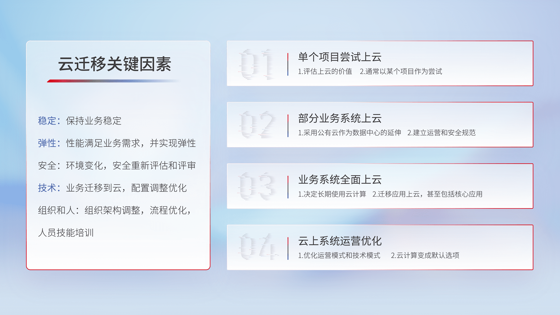 结合实际业务,,,,从规划设计、、、、云平台选型、、、云原生改造、、数据迁移、、、集成交付,,迁移全过程为客户识别最佳上云路径,,做好风险识别管理,,,,设计网络架构、、、身份权限、、、、安全审计合规、、操作审计、、、日志审计、、监控告警策略、、、多站点容灾设计等,,,,对云上基础设施进行整体规划,,,,提升IT治理水平,,,以满足弹性、、高可用、、、高性能的需求。。。